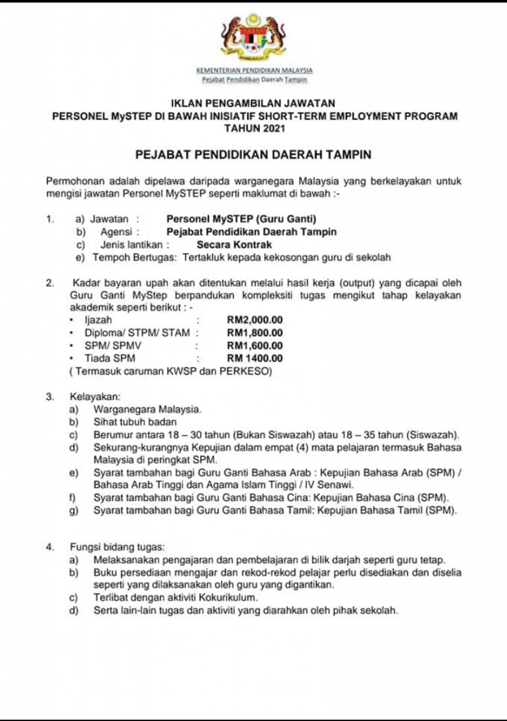 Iklan Jawatan Pejabat Pendidikan Daerah Tampin
