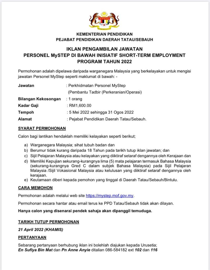 Iklan Jawatan Pejabat Pendidikan Daerah Tatau/Sebauh