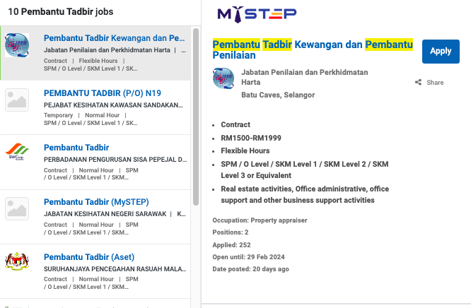 Permohonan jawatan ini boleh dibuat melalui Portal MyFutureJobs. Sila ke Portal MyFutureJobs dan Masukkan Kata Carian yang ingin dicari “ PEMBANTU TADBIR” di bahagian carian untuk memohon jawatan yang diiklankan.