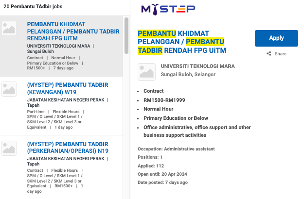 Permohonan jawatan ini boleh dibuat melalui Portal MyFutureJobs. Sila ke Portal MyFutureJobs dan Masukkan Kata Carian yang ingin dicari “PEMBANTU TADBIR” di bahagian carian untuk memohon jawatan yang diiklankan.