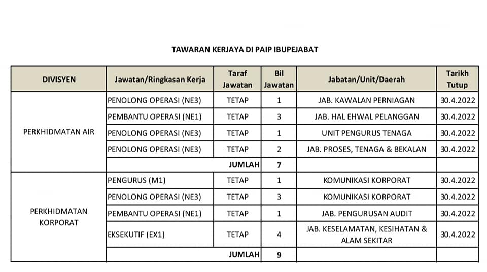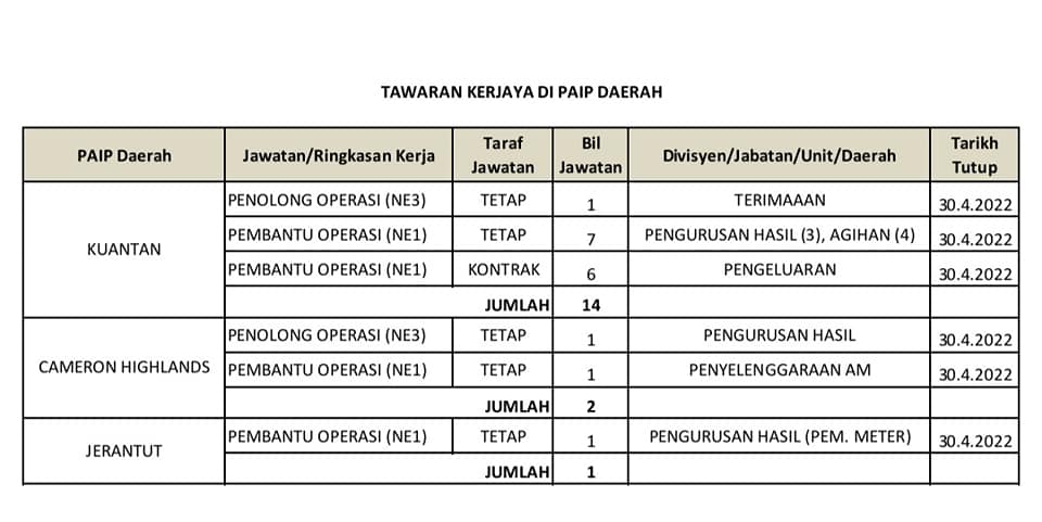 Iklan Jawatan Pengurusan Air Pahang Berhad (PAIP)