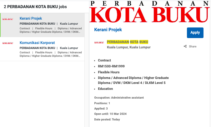 Permohonan jawatan ini boleh dibuat melalui Portal MyFutureJobs. Sila ke Portal MyFutureJobs dan Masukkan Kata Carian yang ingin dicari “PERBADANAN KOTA BUKU” di bahagian carian untuk memohon jawatan yang diiklankan.