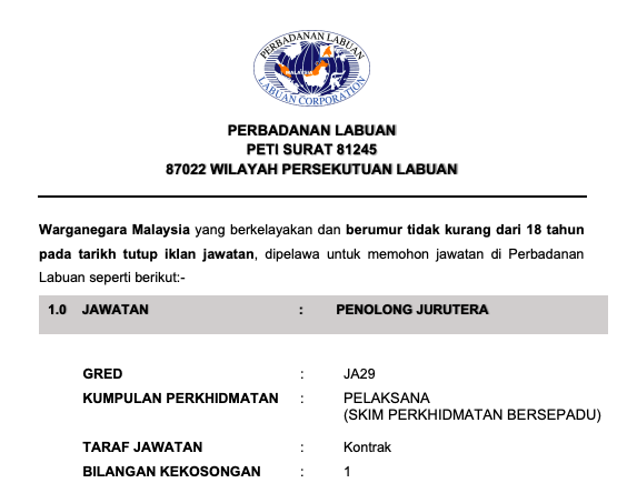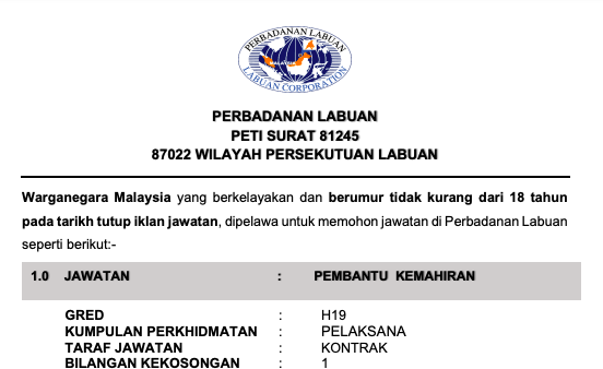 Iklan Jawatan Perbadanan Labuan (PL)