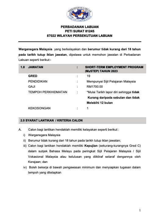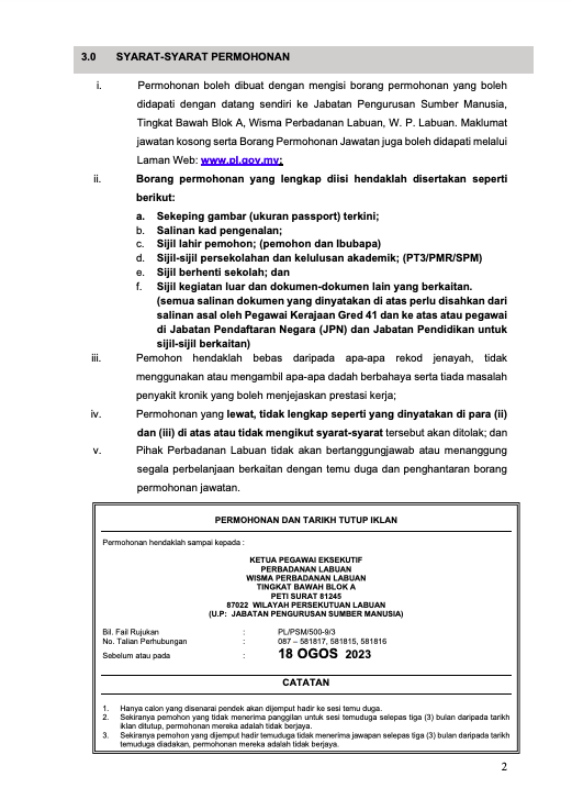 Iklan Jawatan Perbadanan Labuan (PL)