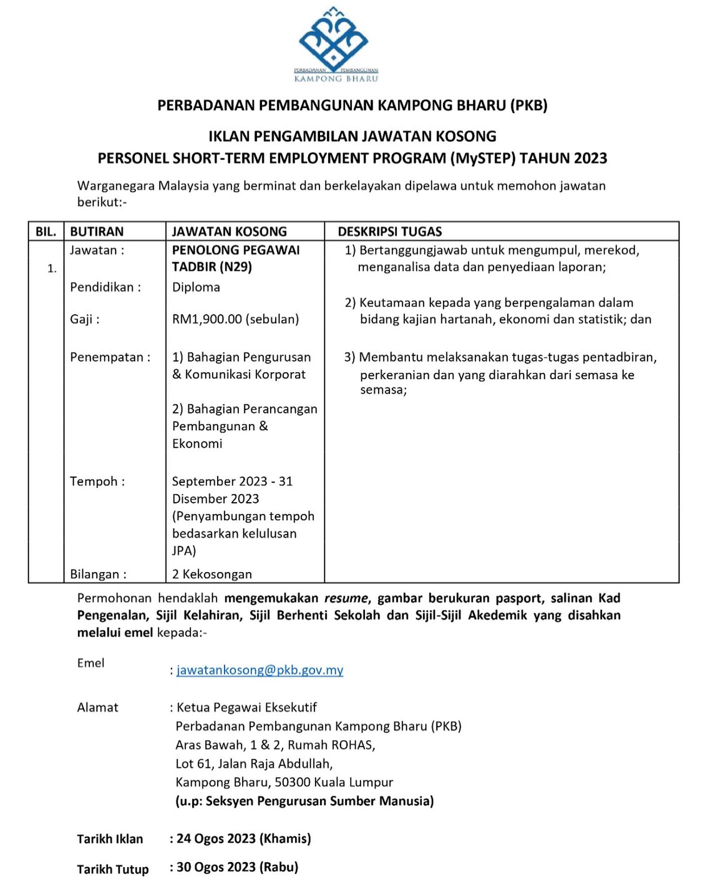 Iklan Jawatan Perbadanan Pembangunan Kampong Bharu