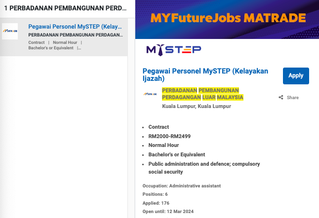 Permohonan jawatan ini boleh dibuat melalui Portal MyFutureJobs. Sila ke Portal MyFutureJobs dan Masukkan Kata Carian yang ingin dicari PERBADANAN PEMBANGUNAN PERDAGANGAN LUAR MALAYSIA di bahagian carian untuk memohon jawatan yang diiklankan.