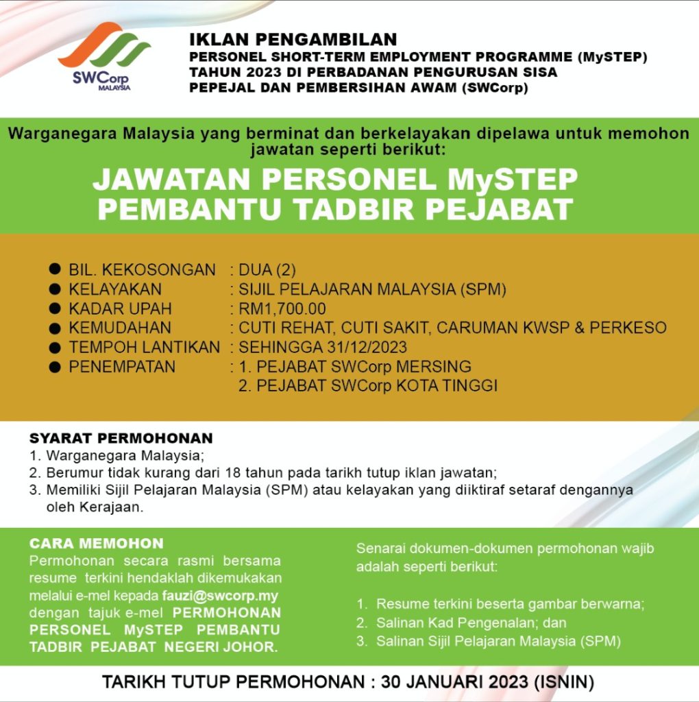Iklan Jawatan Perbadanan Pengurusan Sisa Pepejal Dan Pembersihan Awam (SWCorp)