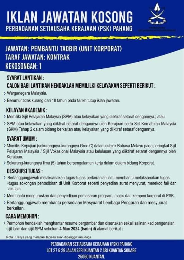 Iklan Jawatan Perbadanan Setiausaha Kerajaan (PSK) Pahang