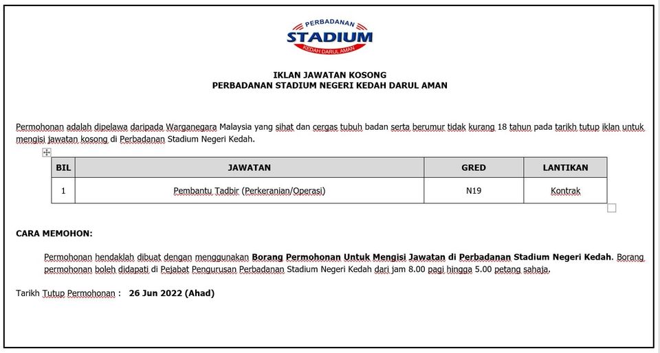 Iklan Jawatan Perbadanan Stadium Negeri Kedah Darul Aman