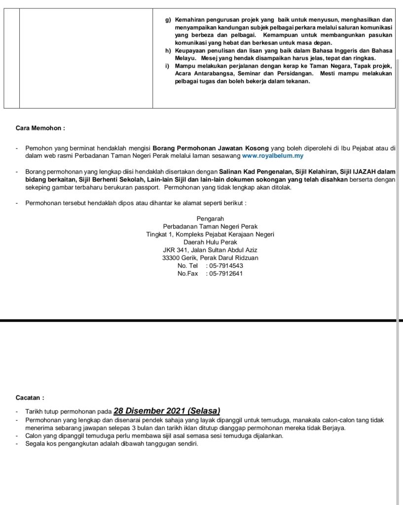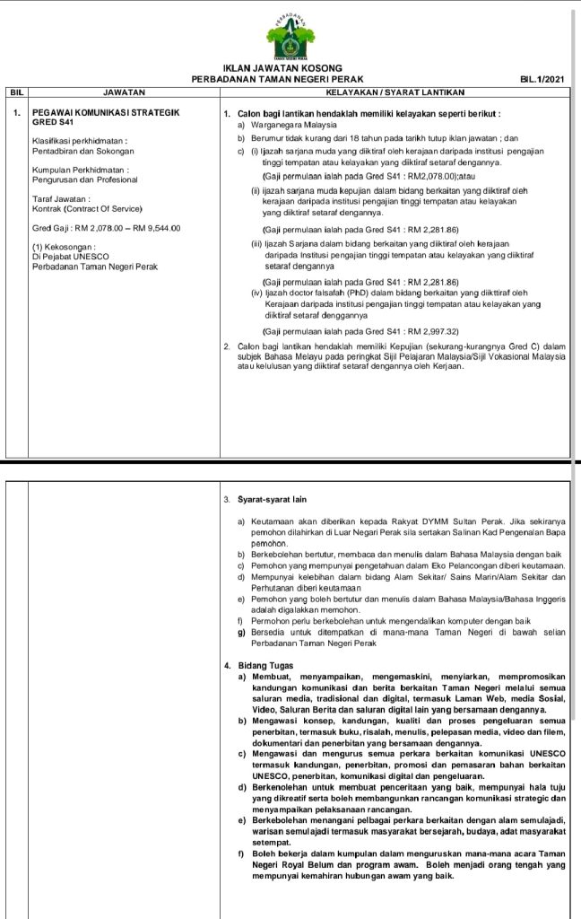 Iklan Jawatan Perbadanan Taman Negeri Perak