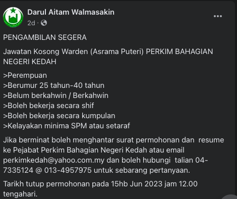 Iklan Jawatan Pertubuhan Kebajikan Islam Malaysia (PERKIM)