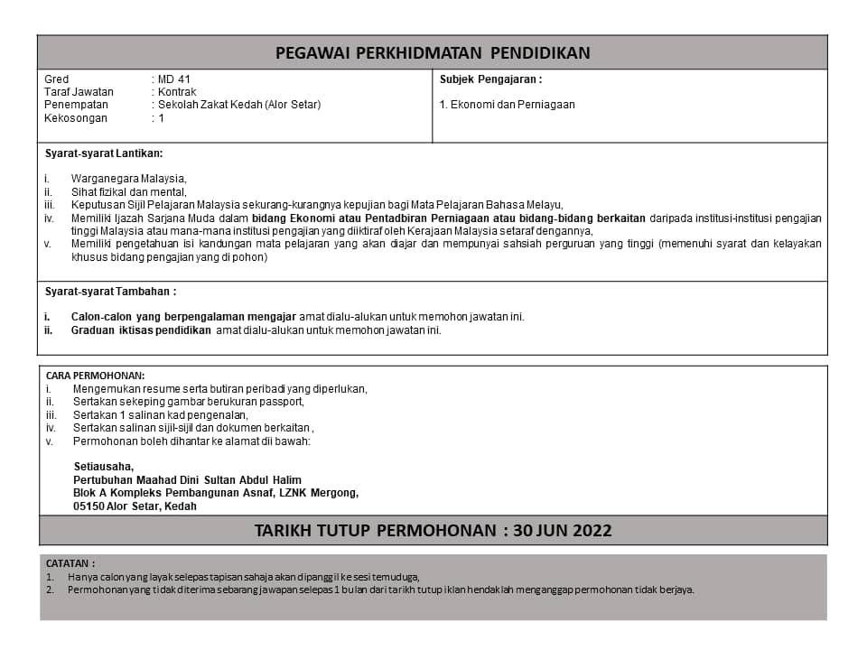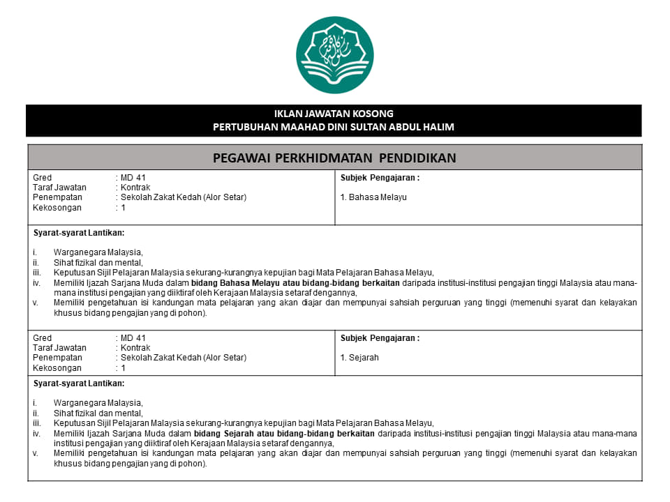 Iklan Jawatan Pertubuhan Maahad Dini Sultan Abdul Halim