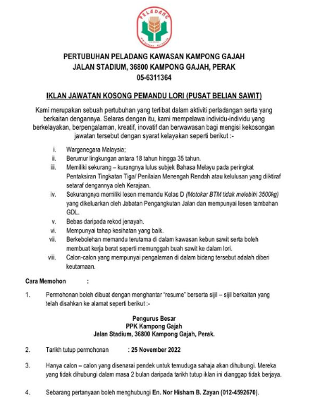 Iklan Jawatan Pertubuhan Peladang Kawasan Kampong Gajah