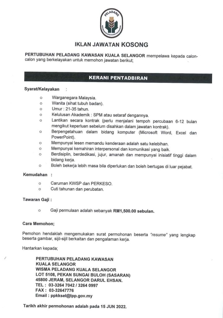 Iklan Jawatan Pertubuhan Peladang Kawasan Kuala Selangor