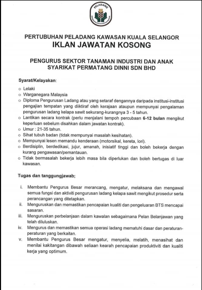 Iklan Jawatan Pertubuhan Peladang Kawasan Kuala Selangor