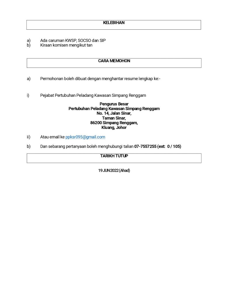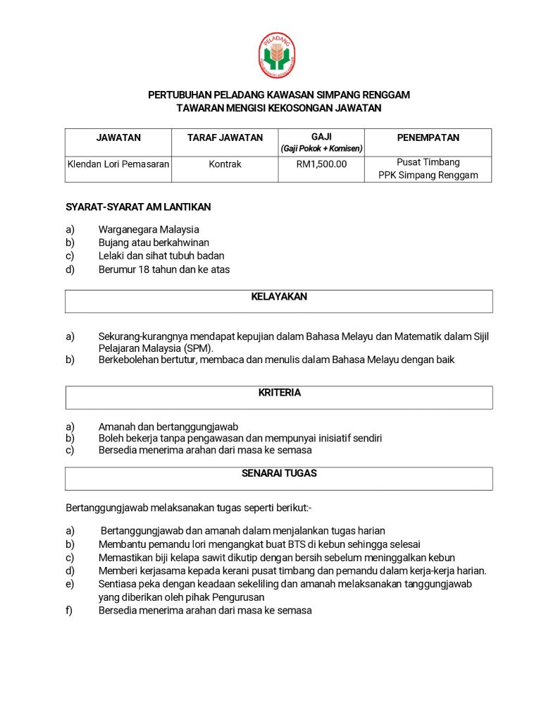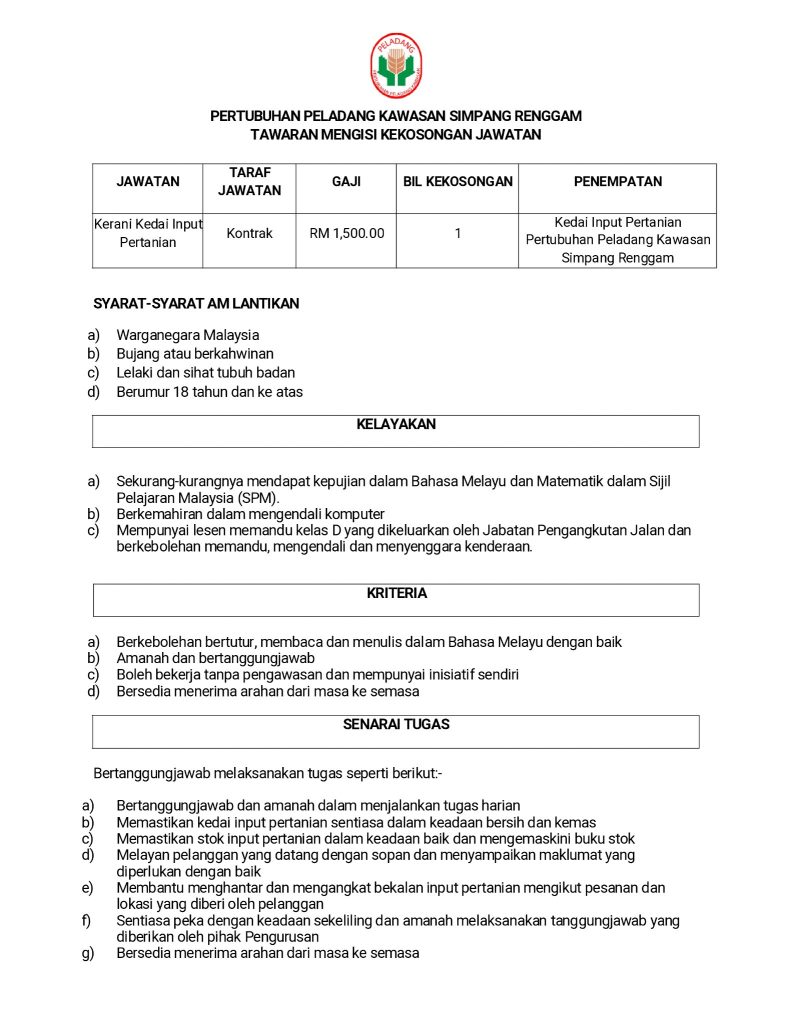 Iklan Jawatan Pertubuhan Peladang Kawasan Ledang Tangkak