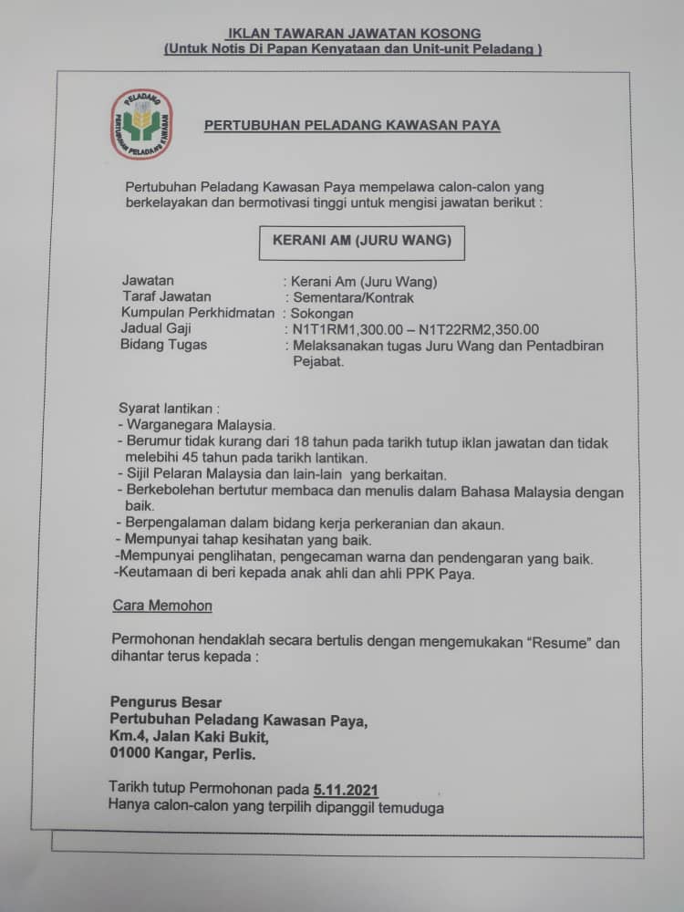 Iklan Jawatan Pertubuhan Peladang Kawasan Paya