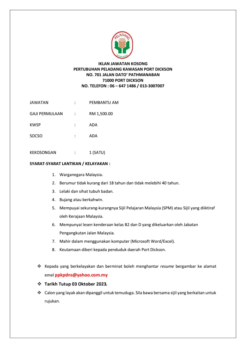 Iklan Jawatan Pertubuhan Peladang Kawasan Port Dickson