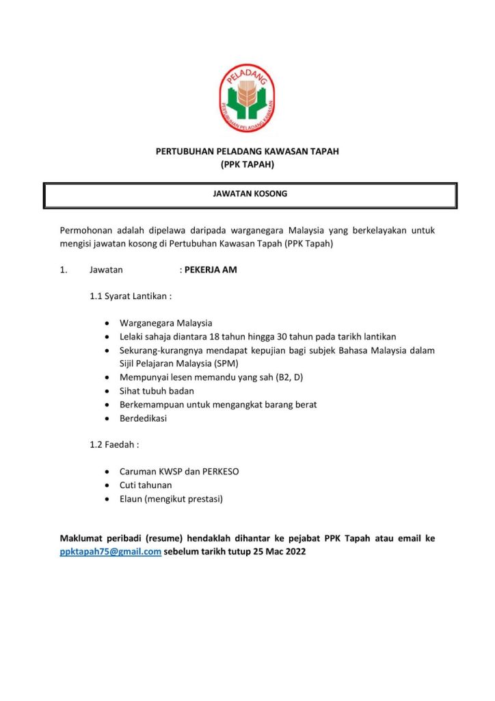 Iklan Jawatan Pertubuhan Peladang Kawasan Tapah