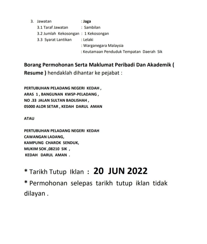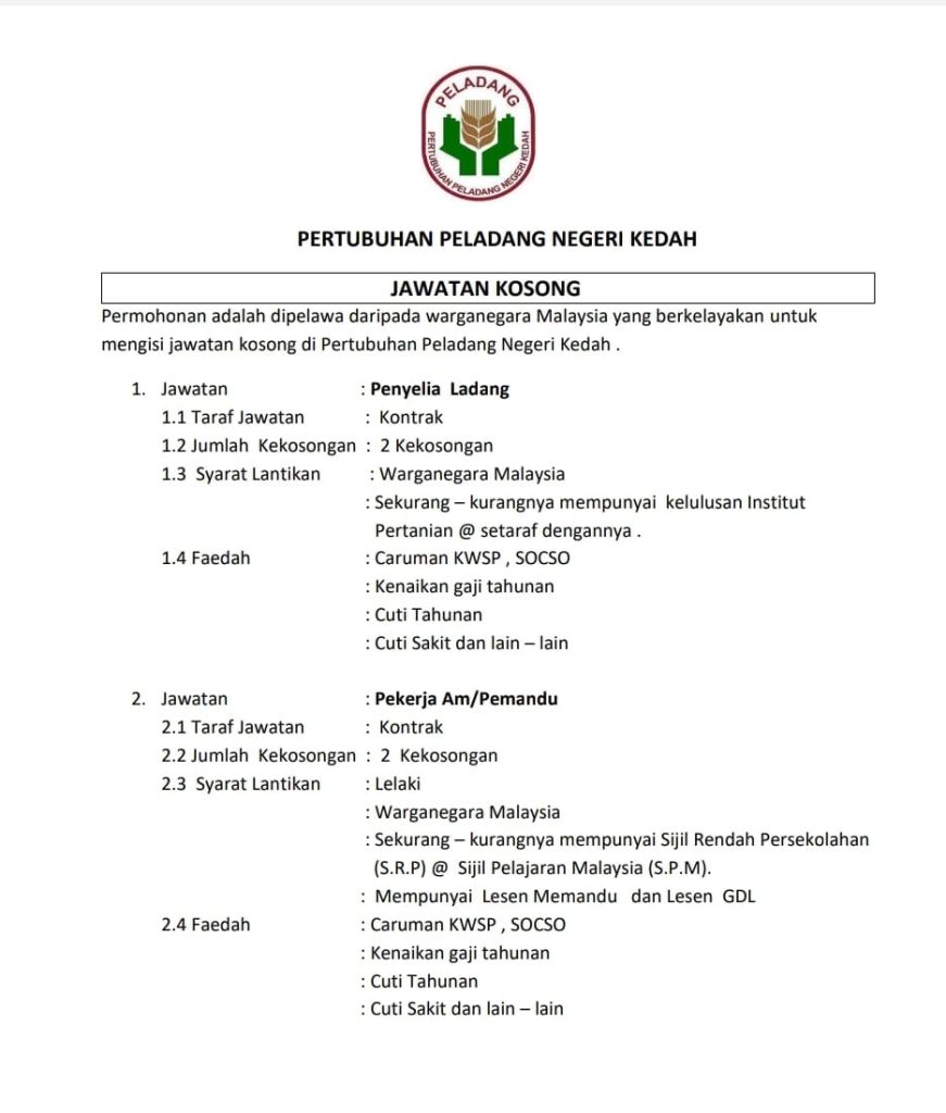 Iklan Jawatan Pertubuhan Peladang Negeri Kedah