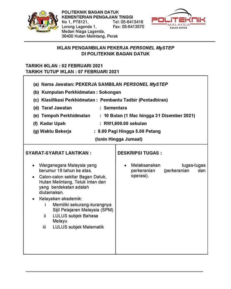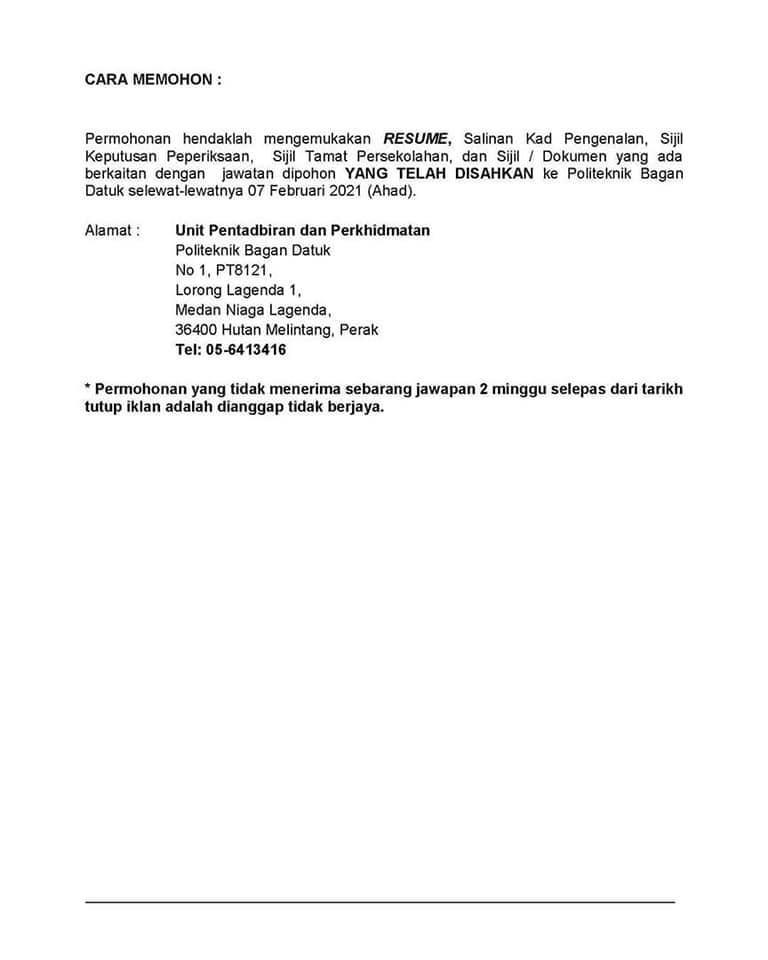 Iklan Jawatan Politeknik Bagan Datuk