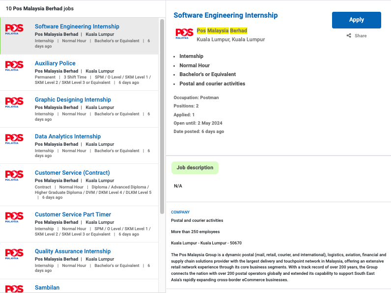 Permohonan jawatan ini boleh dibuat melalui Portal MyFutureJobs. Sila ke Portal MyFutureJobs dan Masukkan Kata Carian yang ingin dicari “Pos Malaysia Berhad” di bahagian carian untuk memohon jawatan yang diiklankan.