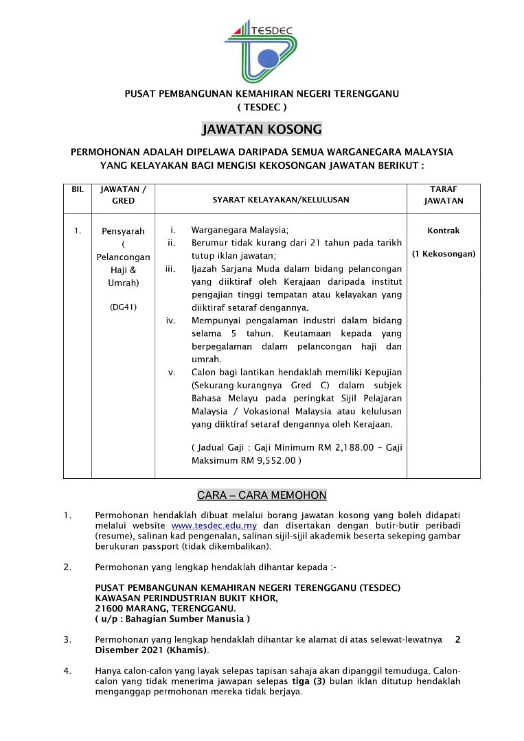 Iklan Jawatan Pusat Pembangunan Kemahiran Negeri Terengganu (TESDEC)
