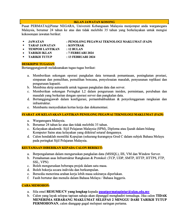 Iklan Jawatan Pusat PERMATA@Pintar Negara, Universiti Kebangsaan Malaysia