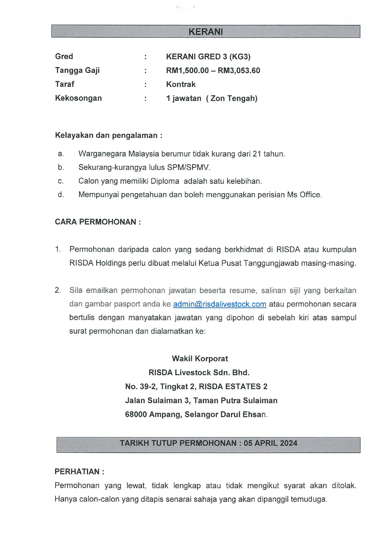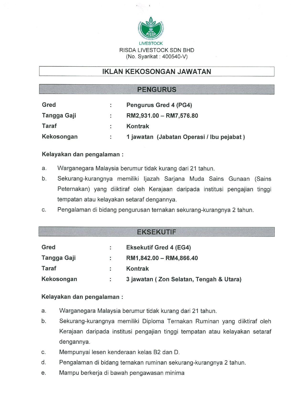 Iklan Jawatan RISDA Livestock Sdn Bhd (RLSB)