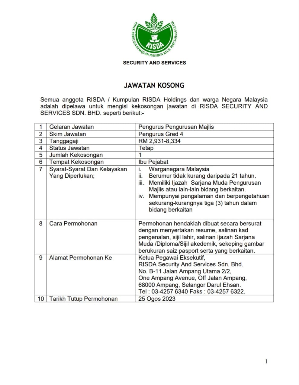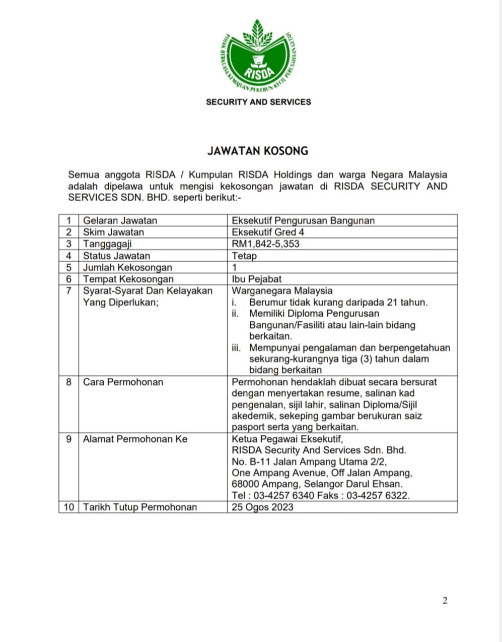 Iklan Jawatan RISDA Security And Services