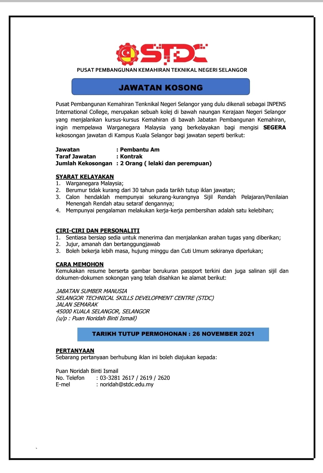 Iklan Jawatan Selangor Technical Skills Development Centre (STDC)