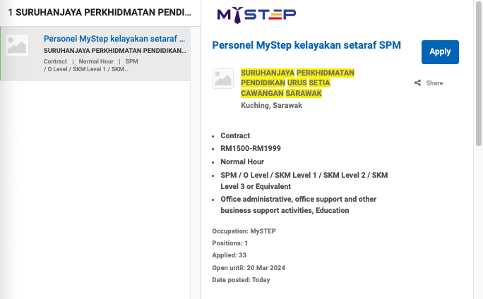Permohonan jawatan ini boleh dibuat melalui Portal MyFutureJobs. Sila ke Portal MyFutureJobs dan Masukkan Kata Carian yang ingin dicari “SURUHANJAYA PERKHIDMATAN PENDIDIKAN URUS SETIA CAWANGAN SARAWAK” di bahagian carian untuk memohon jawatan yang diiklankan.
