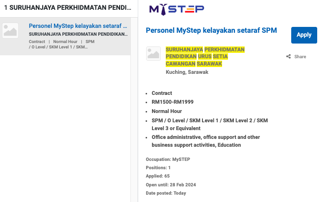 Permohonan jawatan ini boleh dibuat melalui Portal MyFutureJobs. Sila ke Portal MyFutureJobs dan Masukkan Kata Carian yang ingin dicari SURUHANJAYA PERKHIDMATAN PENDIDIKAN URUS SETIA CAWANGAN SARAWAK di bahagian carian untuk memohon jawatan yang diiklankan.