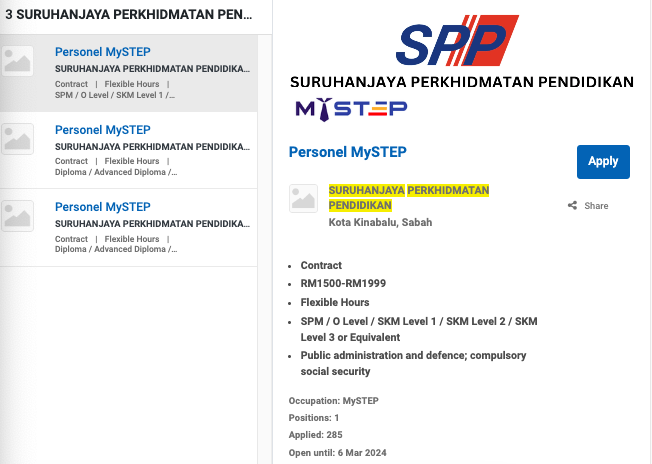 Permohonan jawatan ini boleh dibuat melalui Portal MyFutureJobs. Sila ke Portal MyFutureJobs dan Masukkan Kata Carian yang ingin dicari “SURUHANJAYA PERKHIDMATAN PENDIDIKAN” di bahagian carian untuk memohon jawatan yang diiklankan.