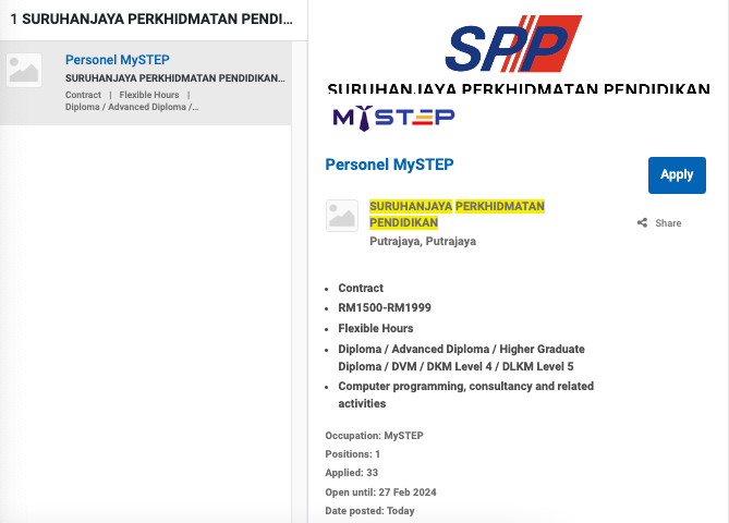 Permohonan jawatan ini boleh dibuat melalui Portal MyFutureJobs. Sila ke Portal MyFutureJobs dan Masukkan Kata Carian yang ingin dicari “SURUHANJAYA PERKHIDMATAN PENDIDIKAN” di bahagian carian untuk memohon jawatan yang diiklankan.