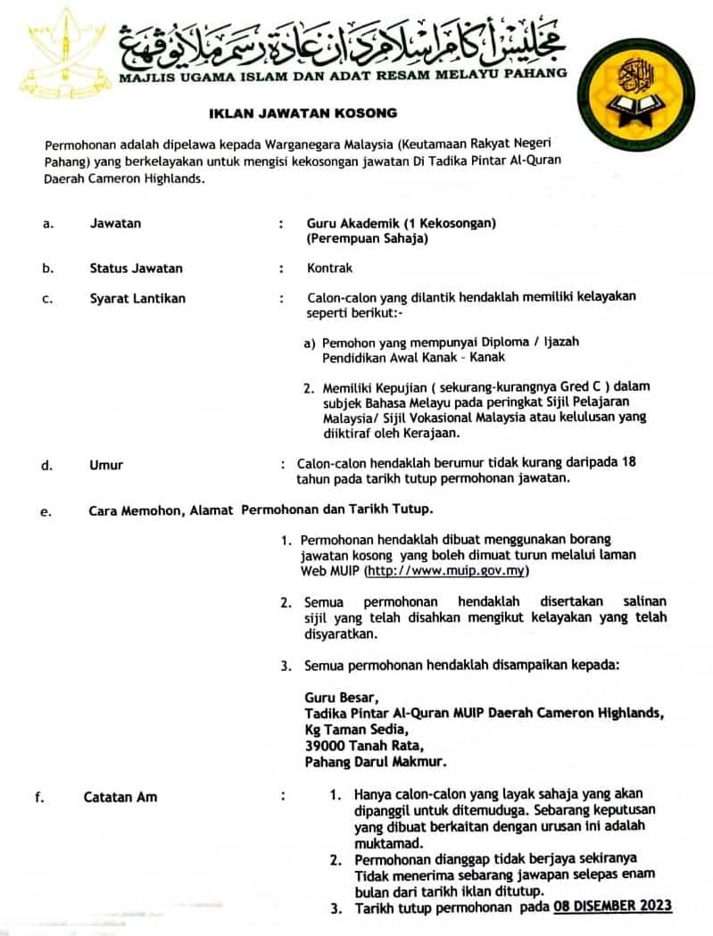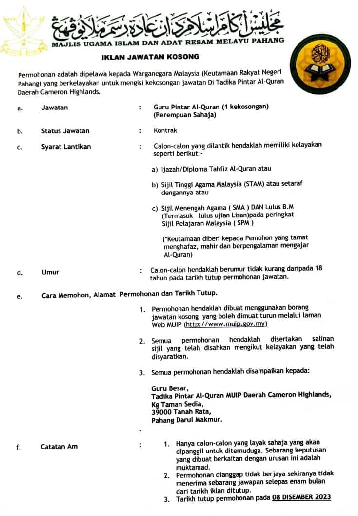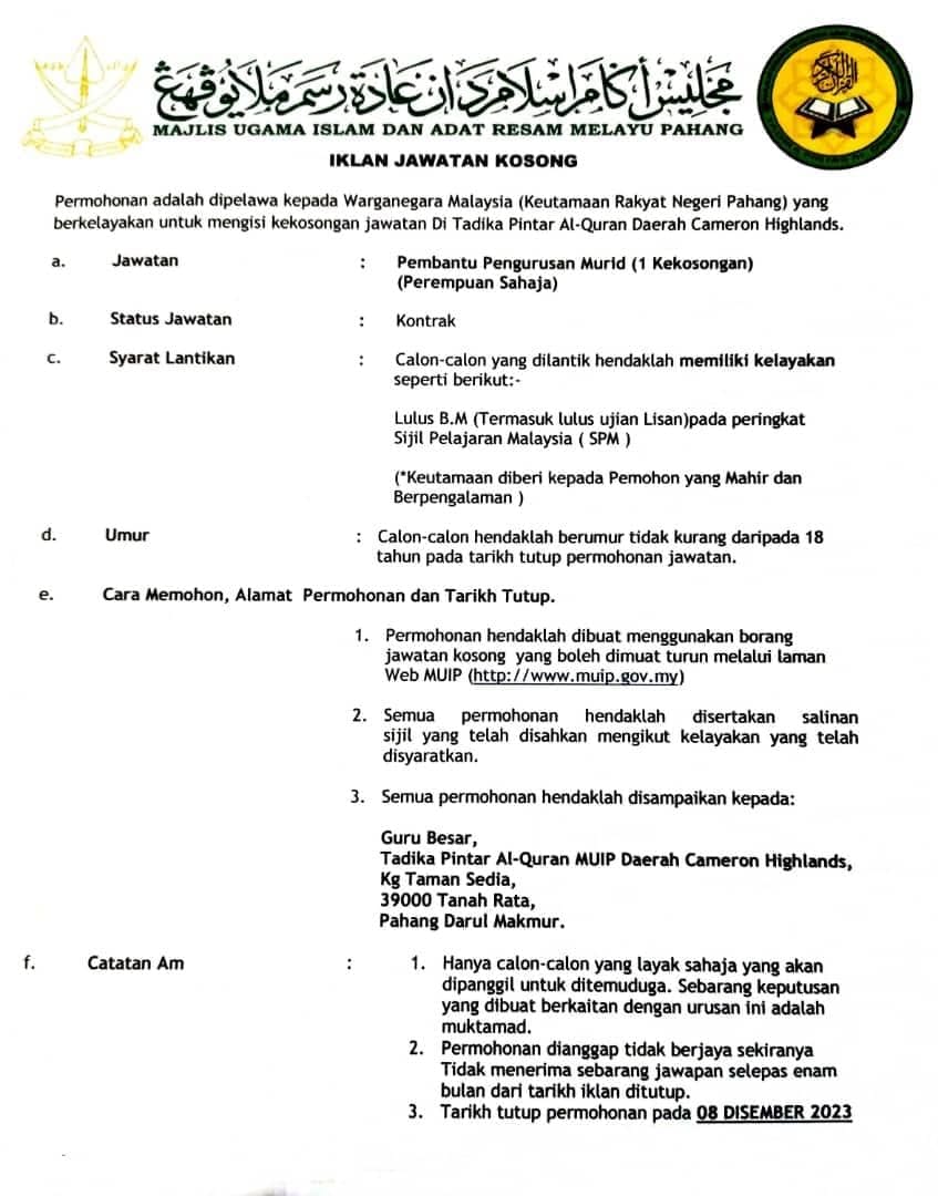 Iklan Jawatan Tadika Pintar Al-Quran Majlis Ugama Islam dan Adat Resam Melayu Pahang (MUIP)