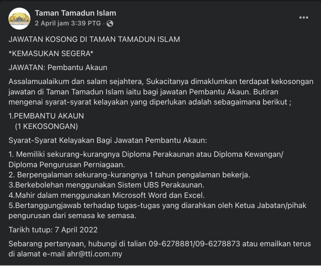 Iklan Jawatan Taman Tamadun Islam