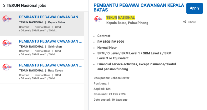 Permohonan jawatan ini boleh dibuat melalui Portal MyFutureJobs. Sila ke Portal MyFutureJobs dan Masukkan Kata Carian “TEKUN NASIONAL” di bahagian carian untuk memohon jawatan yang diiklankan.