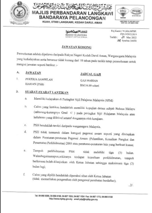 Iklan Jawatan Terkini Majlis Perbandaran Langkawi Bandaraya Pelancongan