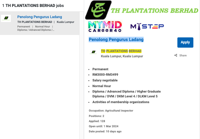 Permohonan jawatan ini boleh dibuat melalui Portal MyFutureJobs. Sila ke Portal MyFutureJobs dan Masukkan Kata Carian yang ingin dicari “TH PLANTATIONS BERHAD” di bahagian carian untuk memohon jawatan yang diiklankan.