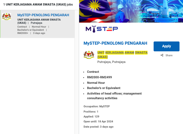 Permohonan jawatan ini boleh dibuat melalui Portal MyFutureJobs. Sila ke Portal MyFutureJobs dan Masukkan Kata Carian yang ingin dicari “Unit Kerjasama Awam Swasta (UKAS)” di bahagian carian untuk memohon jawatan yang diiklankan.