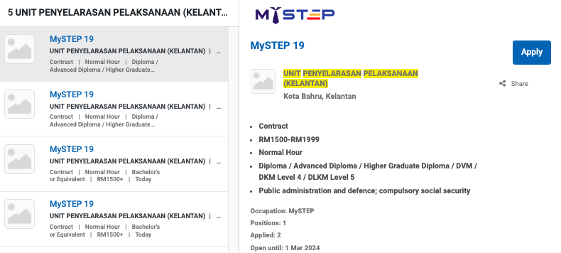 Permohonan jawatan ini boleh dibuat melalui Portal MyFutureJobs. Sila ke Portal MyFutureJobs dan Masukkan Kata Carian “UNITÂ PENYELARASANÂ PELAKSANAANÂ (KELANTAN)” di bahagian carian untuk memohon jawatan yang diiklankan.