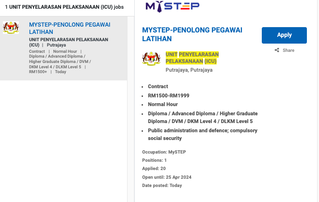 Permohonan jawatan ini boleh dibuat melalui Portal MyFutureJobs. Sila ke Portal MyFutureJobs dan Masukkan Kata Carian yang ingin dicari “UNIT PENYELARASAN PELAKSANAAN (ICU)” di bahagian carian untuk memohon jawatan yang diiklankan.