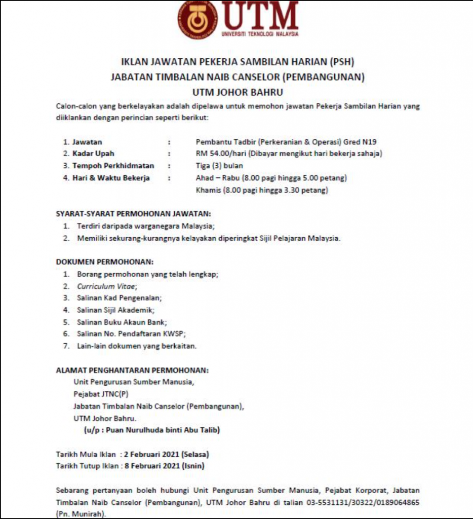Iklan Jawatan Universiti Teknologi Malaysia (UTM)