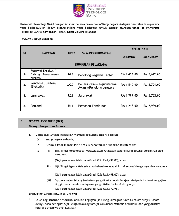 Iklan Jawatan Universiti Teknologi Mara (UiTM) Cawangan Perak, Kampus Seri Iskandar