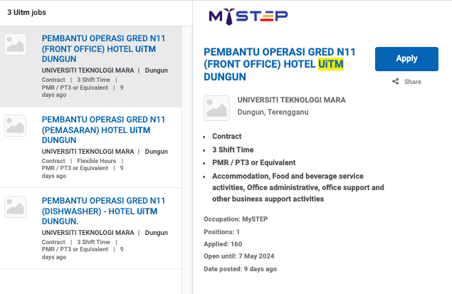 Permohonan jawatan ini boleh dibuat melalui Portal MyFutureJobs. Sila ke Portal MyFutureJobs dan Masukkan Kata Carian yang ingin dicari “UNIVERSITI TEKNOLOGI MARA” di bahagian carian untuk memohon jawatan yang diiklankan.