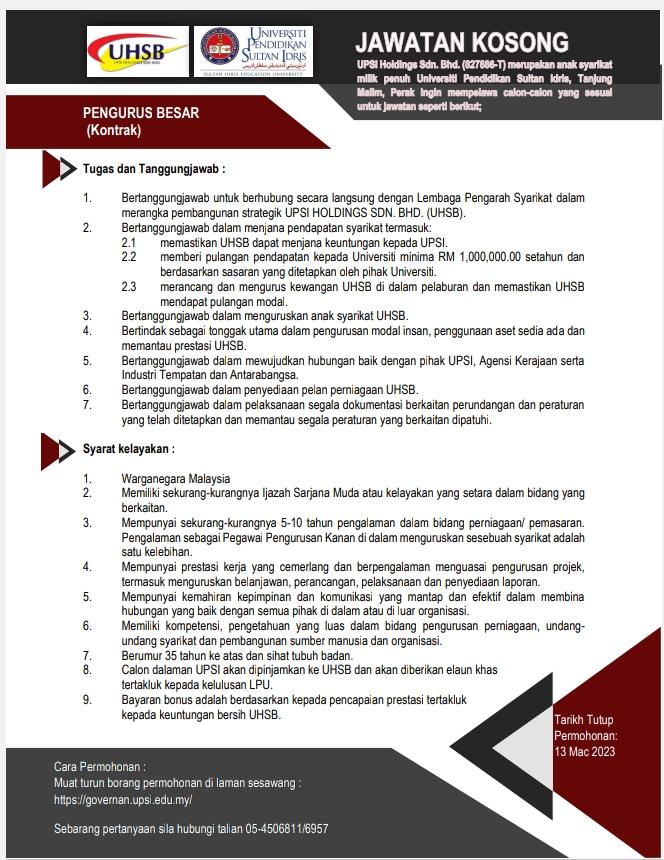 Iklan Jawatan UPSI Holdings Sdn Bhd