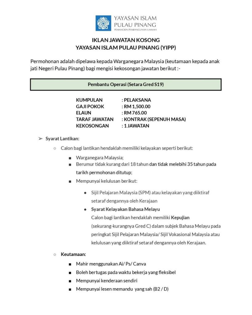Iklan Jawatan Yayasan Islam Pulau Pinang
