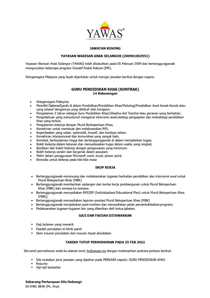 Iklan Jawatan Yayasan Warisan Anak Selangor (YAWAS)
