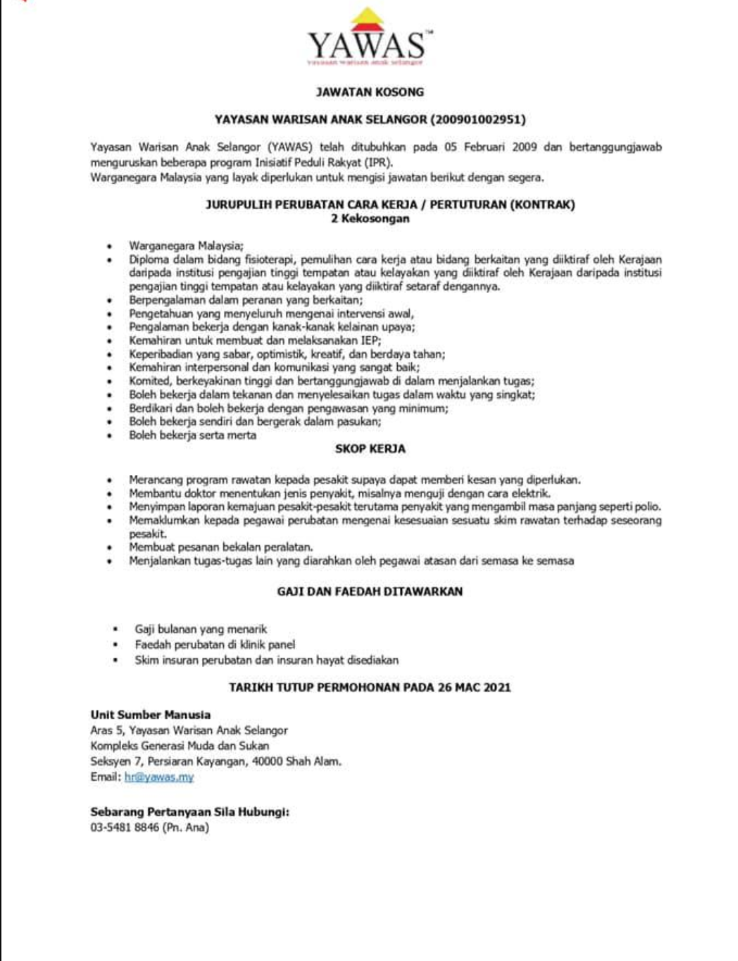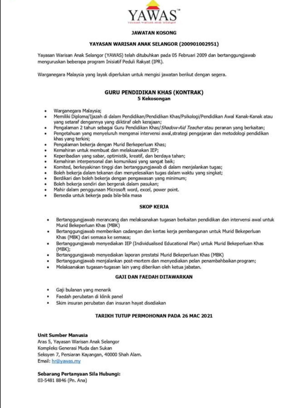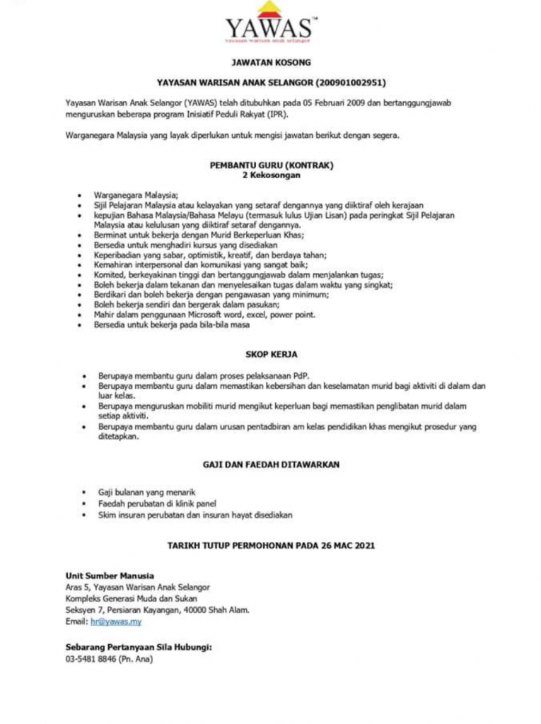 Iklan Jawatan Yayasan Warisan Anak Selangor